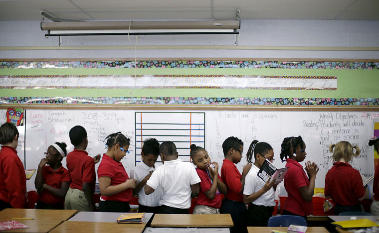 Students in Karesha Solomon's class line up against the wall as they wait to be dismissed for lunch at Hawthorne Elementary School in Tulsa on Feb. 14. After a third-grade teacher left the school earlier this year, Solomon volunteered to take the students into her class. She now teaches a class of almost 40 kids with help from a substitute teacher. JOHN CLANTON/Tulsa World