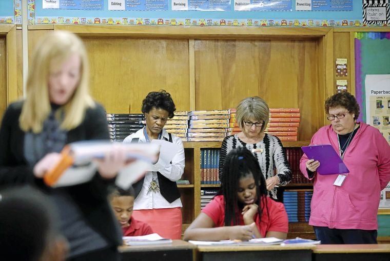 Fifth-grade students Jahlah Smith (second from left) and Tamauria Dixon read along in their textbooks while behind them, Hawthorne Principal Estella Bitson, reading consultant Jeannine Simon and Cindy Kearney evaluate the reading instruction of the school's newest teacher, Stephanie Fadness (foreground). Fadness started about a month ago. JOHN CLANTON/Tulsa World