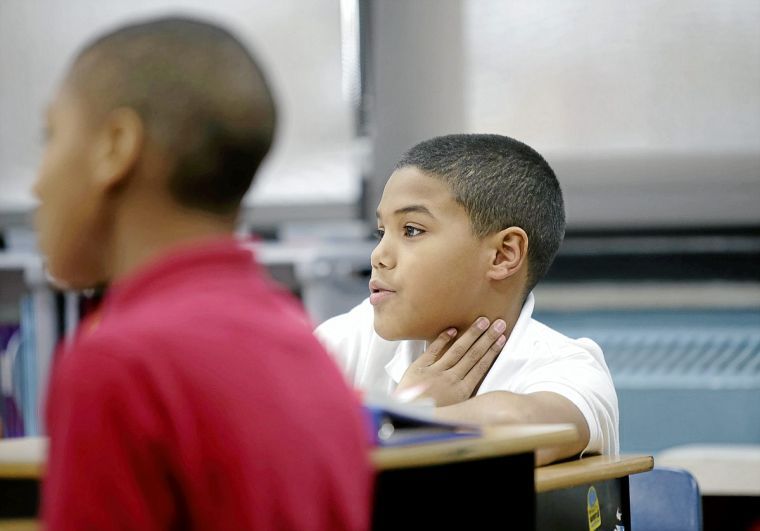 Fifth-grader Cameron Steed (right) participates in a class chant at Hawthorne Elementary School. JOHN CLANTON/Tulsa World
