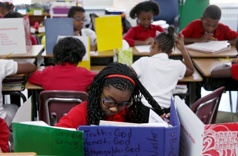 Laila Vester looks over question on a test at Hawthorne Elementary School. The students in Karesha Solomon's class take tests every friday. Most put up folders around their desks to hide their answers. JOHN CLANTON/Tulsa World