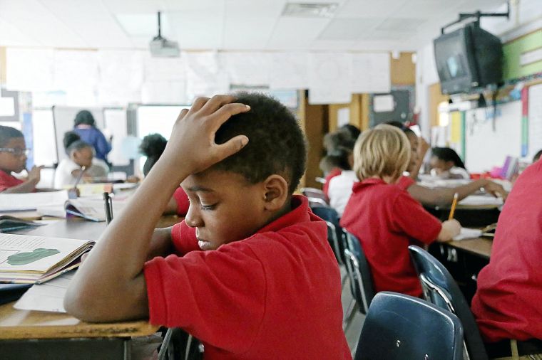 Third grade student Jermico Willis works on schoolwork at his desk under banners of handwritten educational posters in Karesha Solomon's class at Hawthorne Elementary School. JOHN CLANTON/Tulsa World