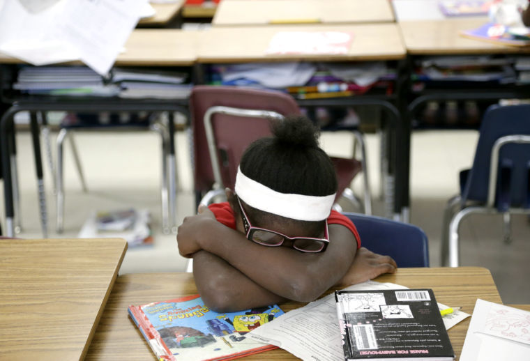 A student lays her head on her desk after being asked to stay in the classroom during recess by her third-grade teacher at Hawthorne Elementary School. Karesha Solomon kept several students in her class during recess for breaking classroom rules in the morning. JOHN CLANTON/Tulsa World