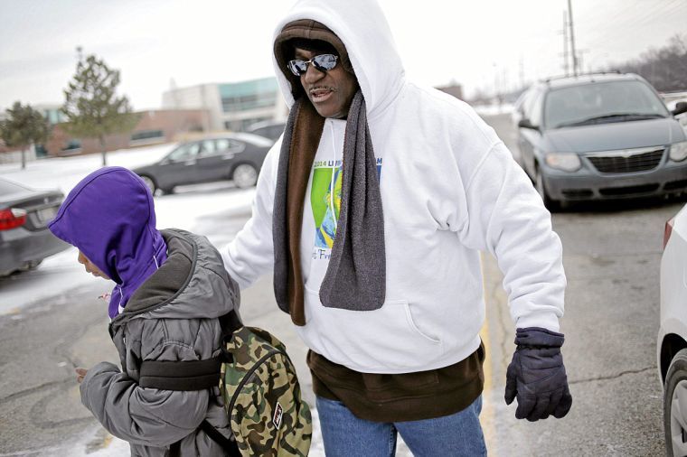 PTA President Thomas Henderson helps a student navigate an icy patch in the parking lot earlier this month as he greets children and their parents in front of Hawthorne Elementary School. JOHN CLANTON/Tulsa World